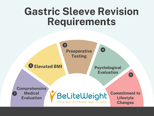 - Elevated BMI: Usually, patients seeking gastric sleeve revision have a BMI within the range of 35-50. Here, the gastric sleeve revision requirements In USA include a demonstration of weight regain and weight loss factors.