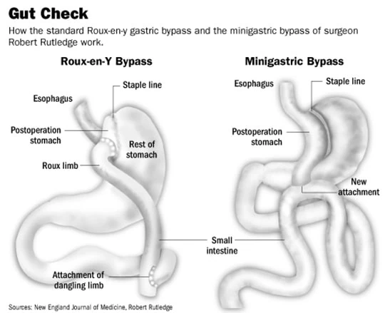 The Mini-Gastric Bypass, which uses the loop reconstruction, has been suggested as an alternative to the Roux en-Y procedure, due to the simplicity of its construction, which reduced the challenge of laparoscopic surgery.